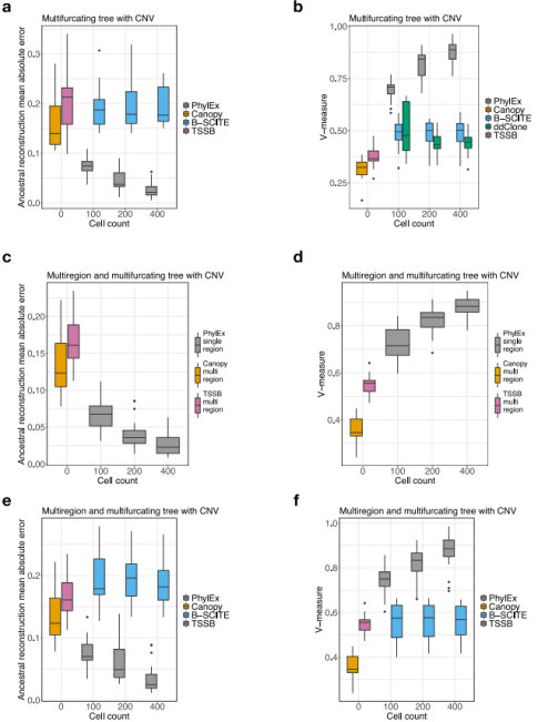 结果显示,DLP克隆树与PhylEx克隆树具有很强的一致性,具有几乎相同的拓扑结构;PhylEx正确分配了24个祖先突变中的23个。在三个聚类指标和祖先重建指标上,研究团队比较了PhylEx与Canopy、TSSB、ddClone和B-SCITE等克隆重建方法的推断结果。结果显示,PhylEx的性能明显优于其他所有方法。
