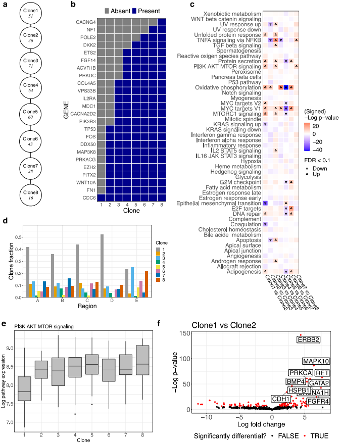 最后,研究团队对MSigDB Hallmark基因集进行了基因集富集分析,结果显示,克隆2中PI3K - AKT MTOR信号通路(乳腺癌中常用的活化治疗靶点)的表达明显高于克隆1;克隆1的所有克隆中PI3K - AKT - MTOR信号通路均上调。此外,与克隆1相比,克隆2中ERBB2存在显著过表达。