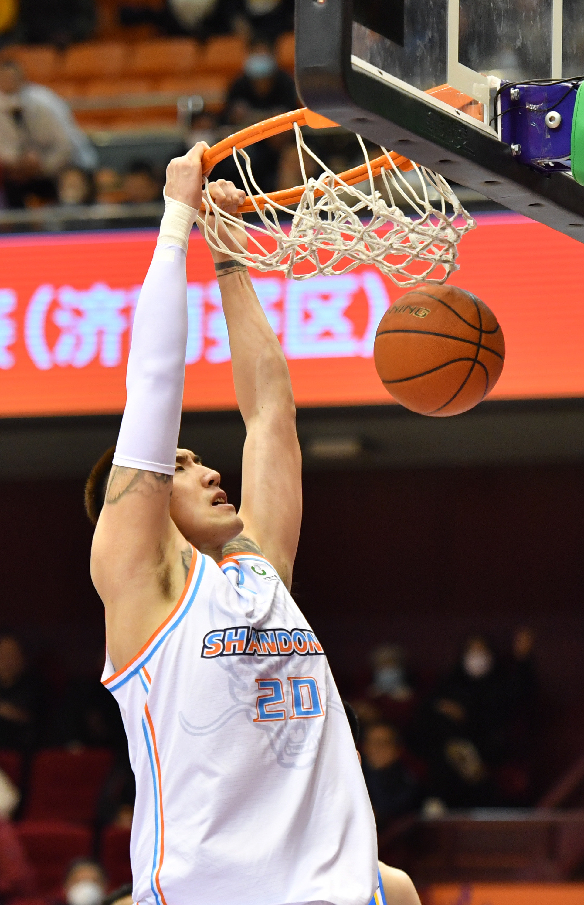 3月12日,山东高速队球员陶汉林在比赛中扣篮。新华社记者 徐速绘 摄