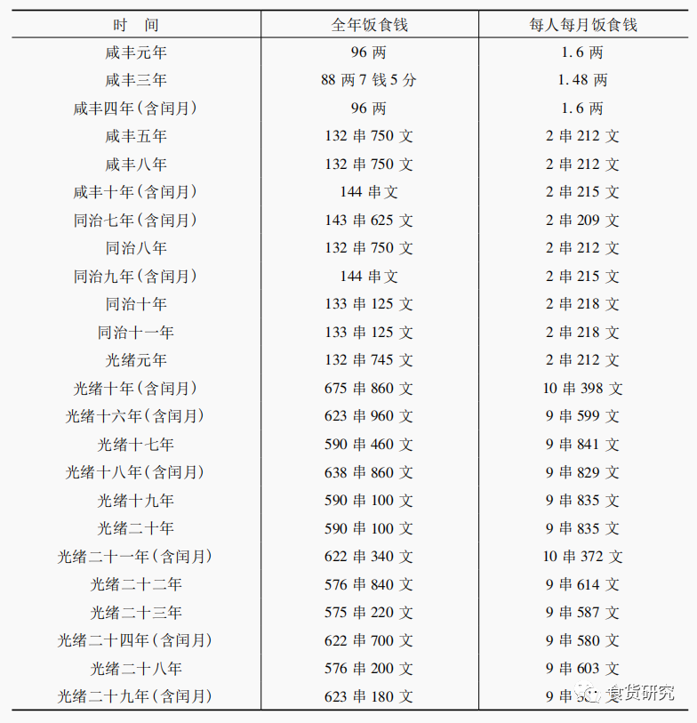 从表1来看,咸同年间,界画匠每人每月的饭食钱较低,只有2串210余文,光绪十年(1884)界画匠的饭食钱开始上涨,基本稳定在每人每月9串文或10串文。