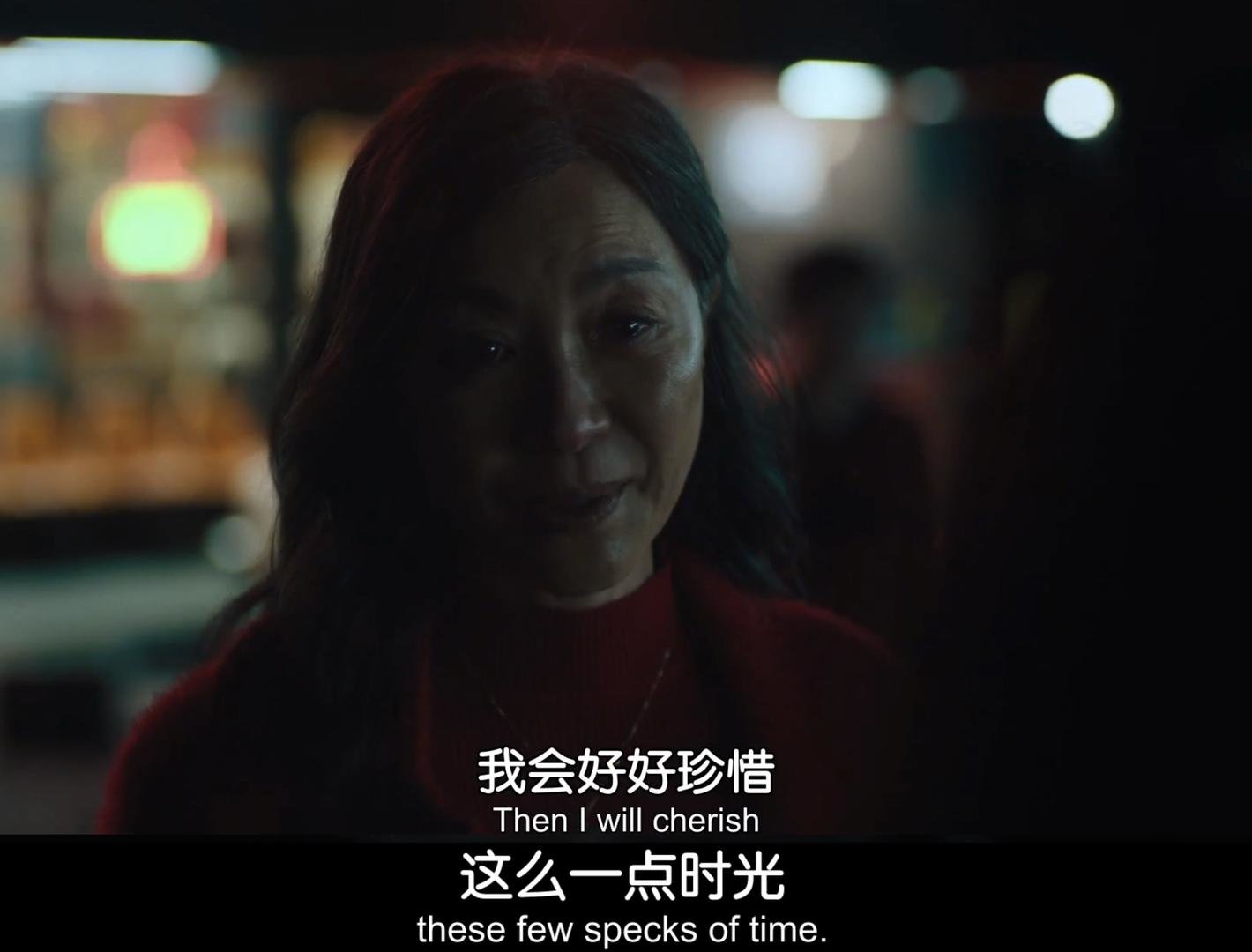 虚无之中,仍有一念,可以选择去爱。“爱”很套路,很烂俗,但人们之所以不厌其烦地解释“爱”,渴望“爱”,正是因为我们匮乏。《瞬息全宇宙》未能免俗,大抵也不想免俗。它所获的褒奖,不正说明导演的答案,可能是西西弗斯唯一的解吗?唯有理解并接受“爱”,我们才不会被虚无裹挟,才能迎来最终的和解,就像伊芙琳那样: