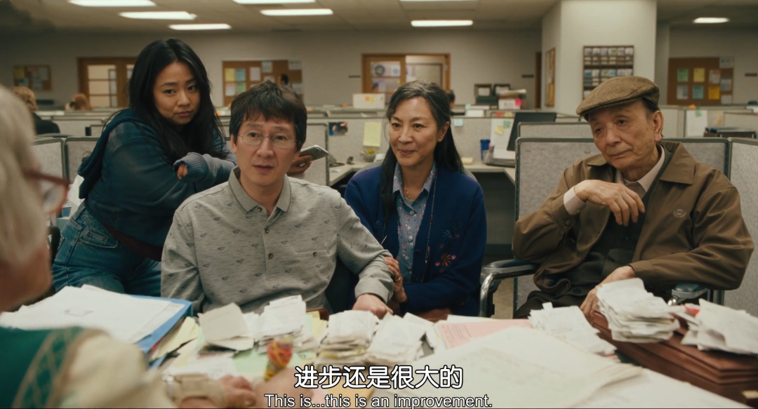电影前十分钟,一个家庭,矛盾重重,慌乱破碎;最后两分钟,如梦一场,阖家其乐融融地走进税务局大楼。这中间的多元宇宙,就像是一场极尽疯癫的表演。释读为伊芙琳的白日梦,亦无不可。仿佛她在用这场想象的狂欢,重新矫正自己对生活、对家庭的理解,从而正视虚无,坦然迎向本就庸常的生活常态。