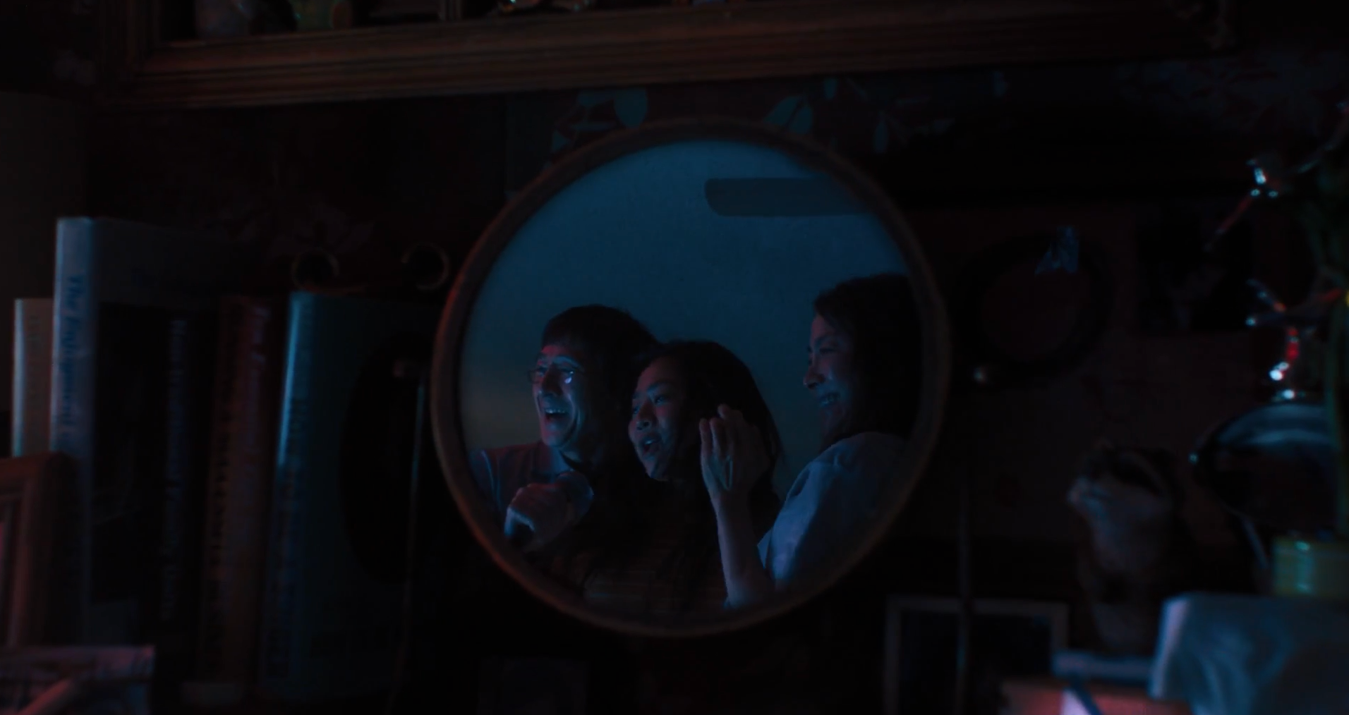 很多人会忽视全片的第一个镜头——在一个拥挤、混乱的柜台上,有一面圆镜。镜中一家三口唱卡拉OK。父亲将话筒递给女儿;母亲却用手捂住了女儿的嘴。随后,母亲才放手,三人继续欢唱。