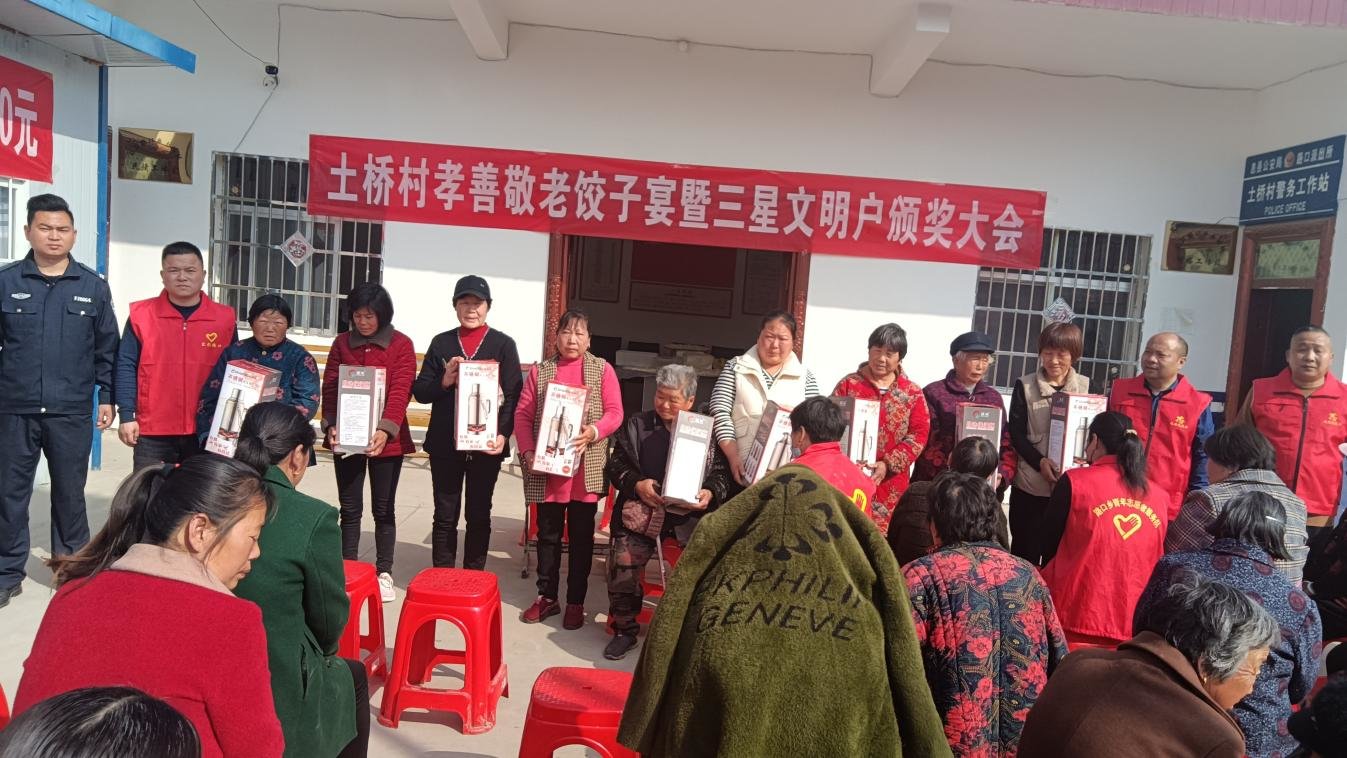 息县白土店乡余围孜村,路口乡王围孜村、土桥村,陈棚乡王林村,长陵乡谢楼村,包信镇王平楼村在饺子宴活动中对第一季度获评的“三星文明户”进行了颁奖、授牌。活动现场,乡镇新时代文明实践所(站)的志愿者们为老人们理发、义诊,陪老人拉家常,活动现场其乐融融,老人们边吃边听边聊,脸上洋溢着幸福的笑容。饺子宴得到在外成功人士的大力支持,白土店乡余围孜村募集善款4000余元,路口乡土桥村募集善款2000余元。