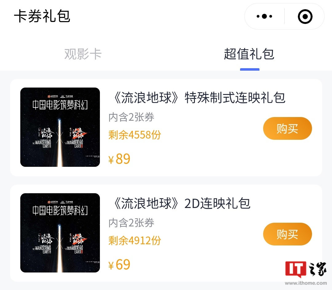 IT之家小伙伴们注意,两部电影需要分开购票,也可以购买 69 元或 89 元的连映礼包(观影格式不同),总之哪种方式便宜就买哪种。