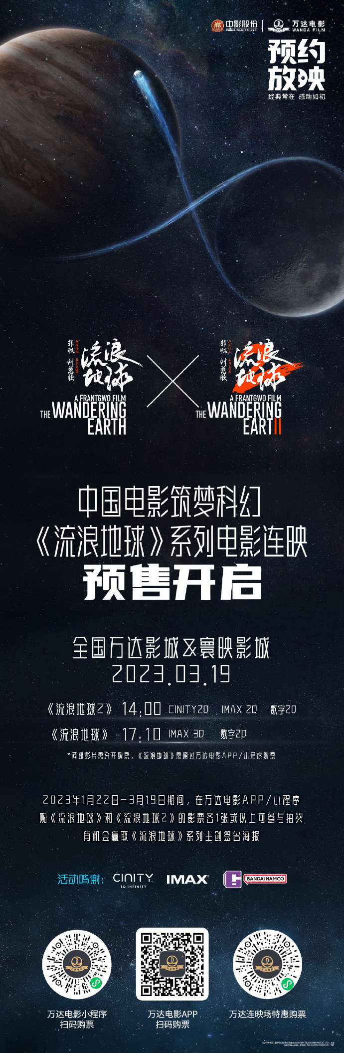 IT之家 3 月 13 日消息,即将在 3 月 19 日(周日)进行的“中国电影筑梦科幻”《流浪地球》系列电影连映,今日在全国万达影城 & 寰映影城正式开启预售。