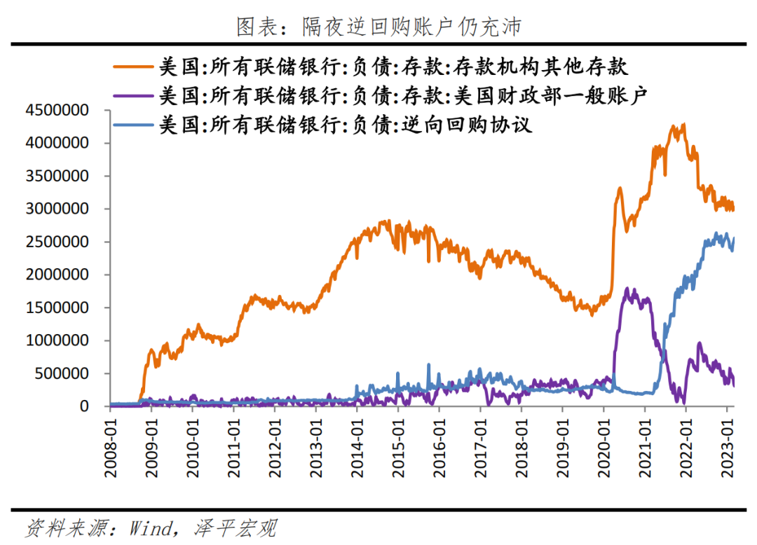自缩表以来,美联储资产负债表累计减少6千亿美元。其中,准备金和TGA账户较高点分别下降30%和83%,但隔夜逆回购账户并未出现显著下降。截至2023年3月8日,隔夜逆回购账户余额约为2.5万亿美元,较高点下降3%,仍处于高位。