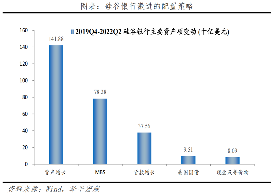 同样的,硅谷银行选择配置美国国债等,较为激进。2019年第四季度至2022年第二季度,硅谷银行资产端增长了1400亿美元;其中55%配置了MBS,7%配置在美国国债上,而现金及等价物仅6%。