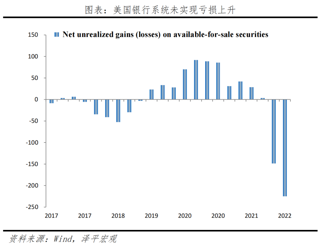 大幅度加息暴露潜在金融风险,2022年3月,美联储宣布开始加息,截至2023年3月,美联储累计加息450个基点,导致美债收益率快速飙升。此前在流动性宽松背景下大量购买的美债资产价格出现大幅下跌,被归类为可出售资产(AFS)的美国国债开始出现浮亏。虽然AFS亏损可以转回,但当银行开始出售AFS兑换流动性时,AFS的亏损则必须计入损失。根据FDIC数据,截至2022年第四季度,美国银行系统内未实现损失约为6200亿美元,其中可售国债及证券约为2795亿美元。