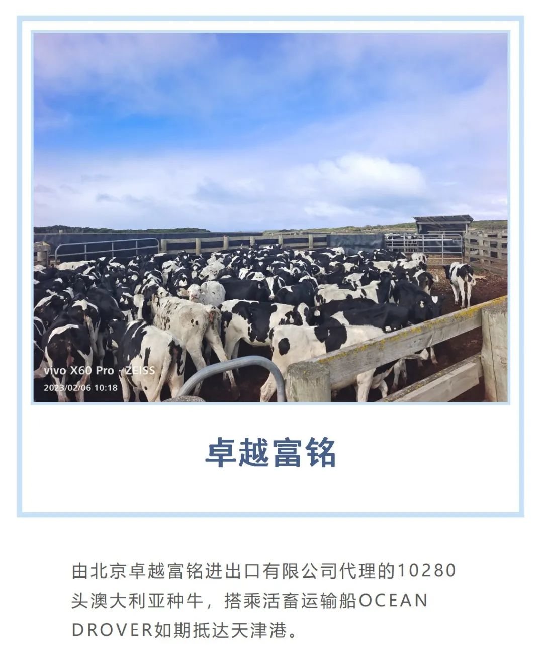 3月6日,由北京卓越富铭进出口有限公司代理的10280头澳大利亚种牛,搭乘活畜运输船OCEAN DROVER如期抵达天津港,这是卓越富铭2023年以来的第3船优质种牛。