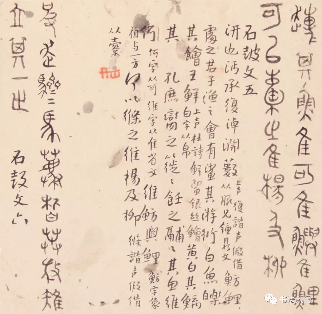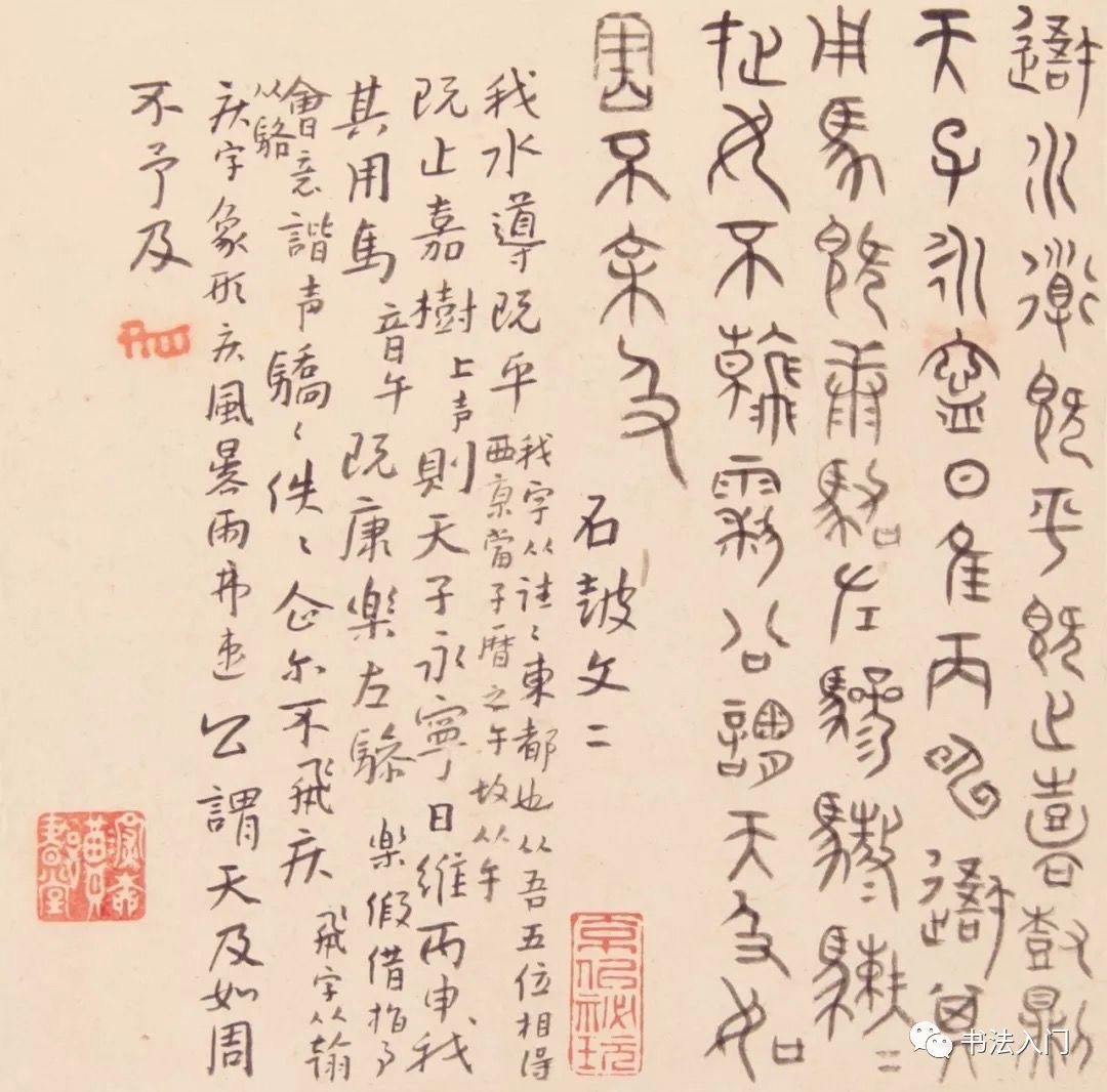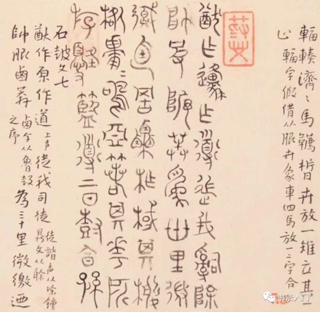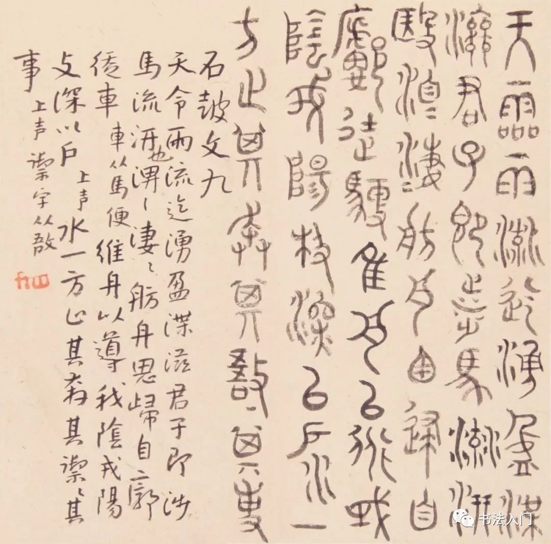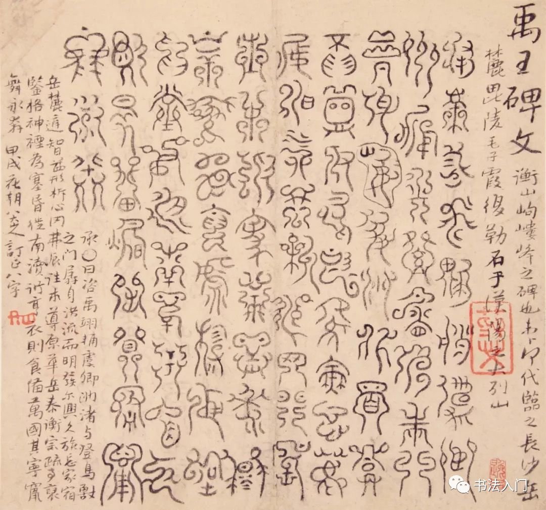 朱耷(八大山人)也曾临习《石鼓文》、《禹王碑》等最古老的石刻文字。但是,他不是亦步亦趋根据原碑刻进行临写,而是以独特的八大体书法进行临仿,从中提取自己需要的笔法和审美特质,再进行书法间架结构的布局,强化了笔墨线条的表现能力。
