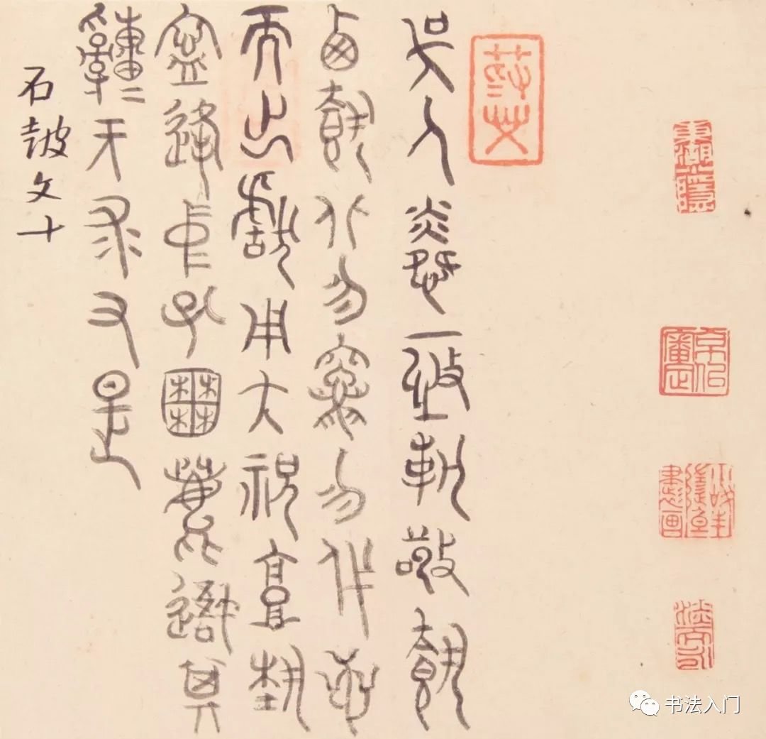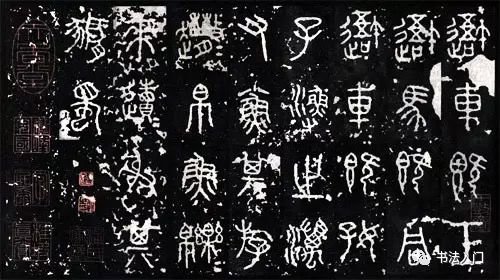 篆书(甲骨文和象形文字)也是汉字的肇始。至今发现的先秦刻石文字遗存,最早的要属《石鼓文》,在书法史上属于大篆,也称“籀文”。该刻石于唐初被发现。原石作鼓形,共十石,分别刻有四言诗一首,径约三尺余。内容记述秦国君田猎之事,故又称“猎碣”。曾被弃于陈仓云野,故又称“陈仓十碣”。原石在天兴(今陕西宝鸡)三畤原,历经辗转,今石藏北京故宫博物院。