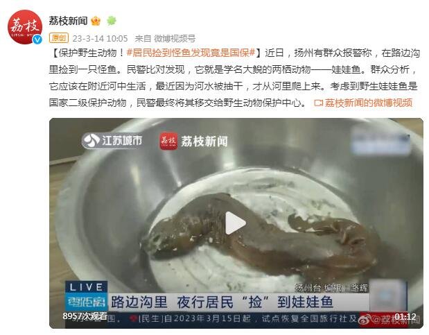 近日,扬州有群众报警称,在路边沟里捡到一只怪鱼。民警比对发现,它就是学名大鲵的两栖动物——娃娃鱼。群众分析,它应该在附近河中生活,最近因为河水被抽干,才从河里爬上来。考虑到野生娃娃鱼是国家二级保护动物,民警最终将其移交给野生动物保护中心。