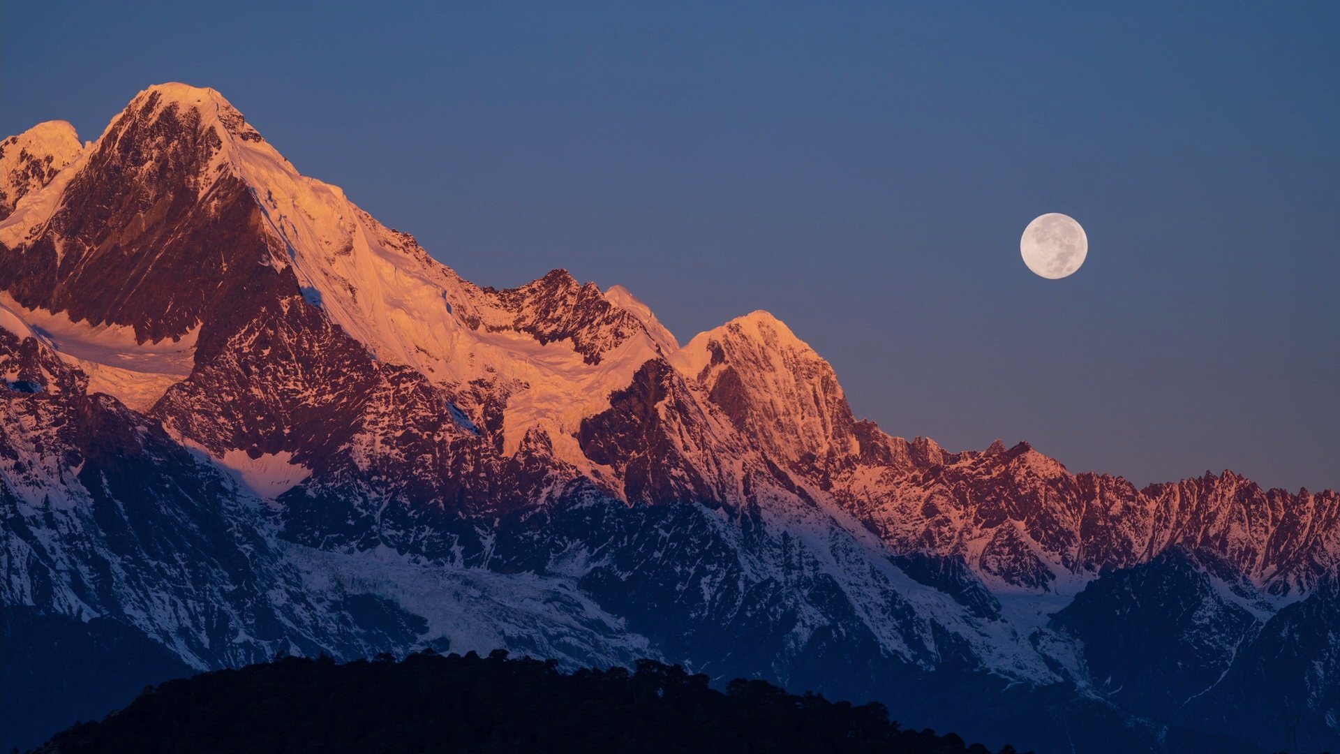 近期,有摄影师拍到梅里雪山的日照金山与满月浪漫同框。日升月落间,梅里雪山光影变幻,雪山反射的金光与月光交相辉映,日照金山与满月在此刻相遇,浪漫又震撼。