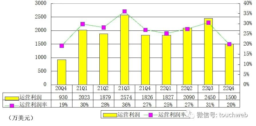 雅乐科技2022年第四季度运营利润为1500万美元,运营利润率为20%。