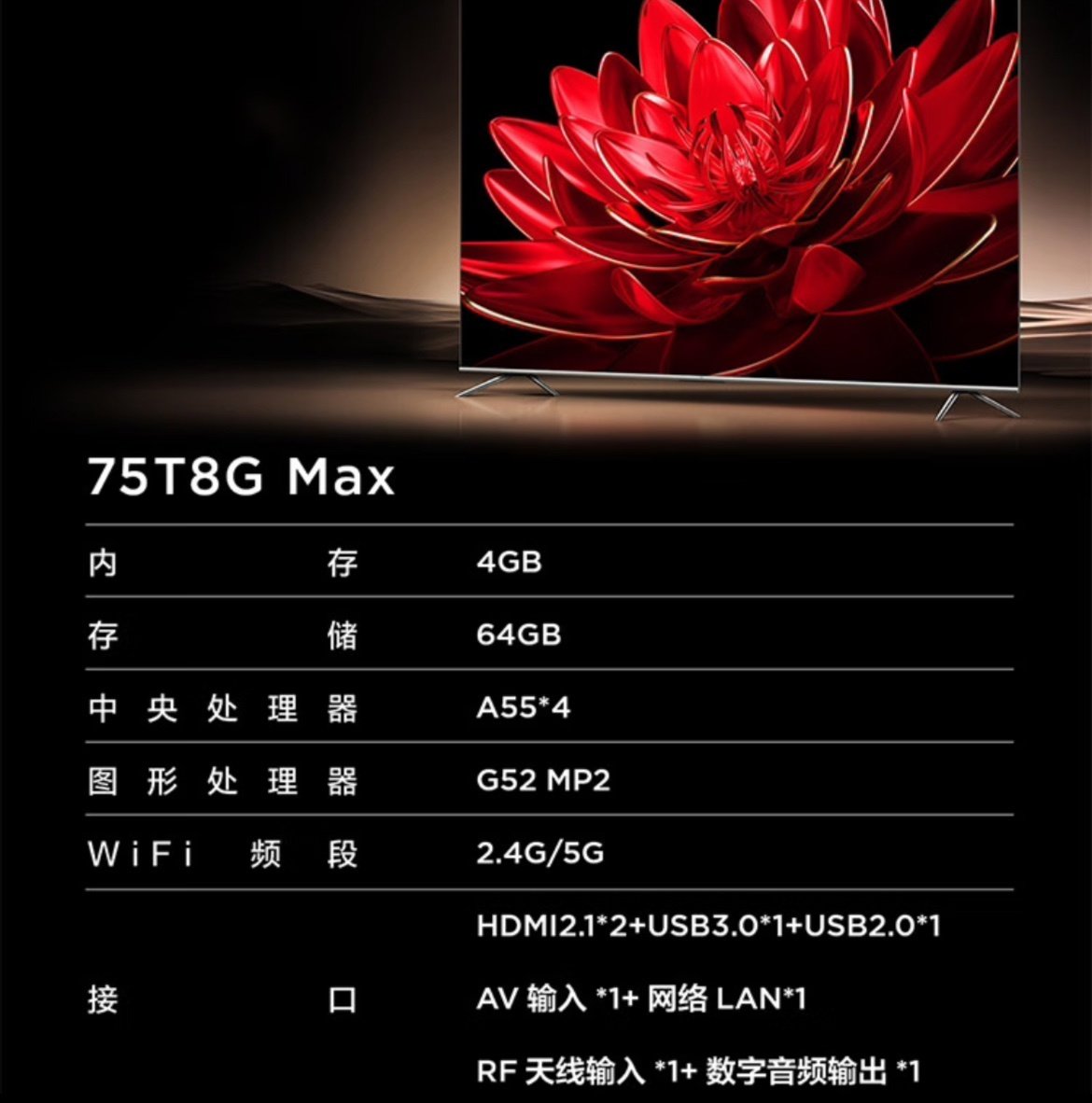 而在处理器方面,新品选用了领曜芯片 M2,在 TCL 特有的 TXR 画质引擎的配合下,可对画质进行像素级调教,逐帧还原精彩画面。T8G Max 电视还配备了 2.1 声道 Hi-Fi 级专业音响,后置独立 20W 超潜低音怕音响单元,声音层次感更重。除了上述提及的配置以外,这款电视还可通过灵控桌面,做到 0.7 秒快速开机,并可实现全场景免遥控 AI 声控。