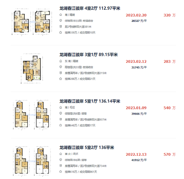 据了解,该房源所属小区是首开龙湖春江彼岸,目前在二手房网站上,挂牌均价是34871元/㎡,近90天成交有4套,近30天带看了196次,还是颇有人气的。具体成交上,因为建筑类型、楼层、户型等不同,成交均价在2.8-4.2万/㎡不等。