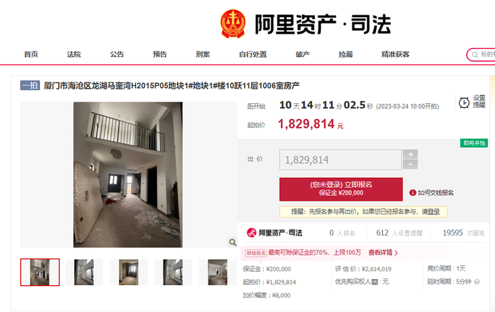 近期,阿里法拍网上架一套房源,海沧区龙湖马銮湾H2015P05地块1#地块1#楼10跃11层1006室房产,起拍价约183万,将于3月24日开拍。