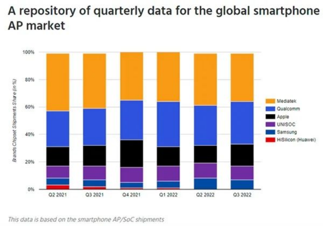 三个月前,调研机构Counterpoint Research公布了2022年三季度全球智能手机AP(应用处理器)市场出货份额报告。