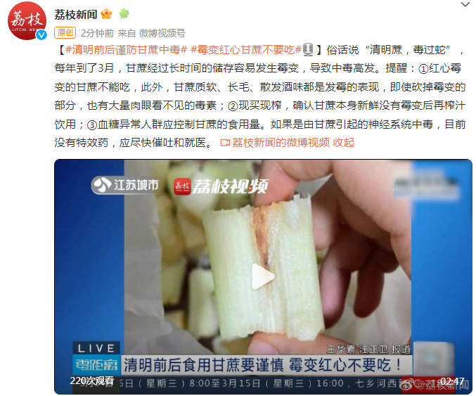 俗话说“清明蔗,毒过蛇”,每年到了3月,甘蔗经过长时间的储存容易发生霉变,导致中毒高发。提醒:①红心霉变的甘蔗不能吃,此外,甘蔗质软、长毛、散发酒味都是发霉的表现,即使砍掉霉变的部分,也有大量肉眼看不见的毒素;②现买现榨,确认甘蔗本身新鲜没有霉变后再榨汁饮用;③血糖异常人群应控制甘蔗的食用量。如果是由甘蔗引起的神经系统中毒,目前没有特效药,应尽快催吐和就医。