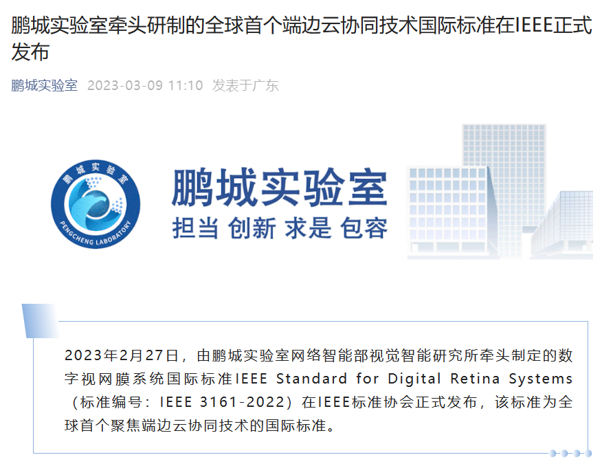 IT之家 3 月 14 日消息,据鹏城实验室消息,2 月 27 日,由鹏城实验室网络智能部视觉智能研究所牵头制定的数字视网膜系统国际标准 IEEE Standard for Digital Retina Systems(标准编号:IEEE 3161-2022)在 IEEE 标准协会正式发布,该标准为全球首个聚焦端边云协同技术的国际标准。