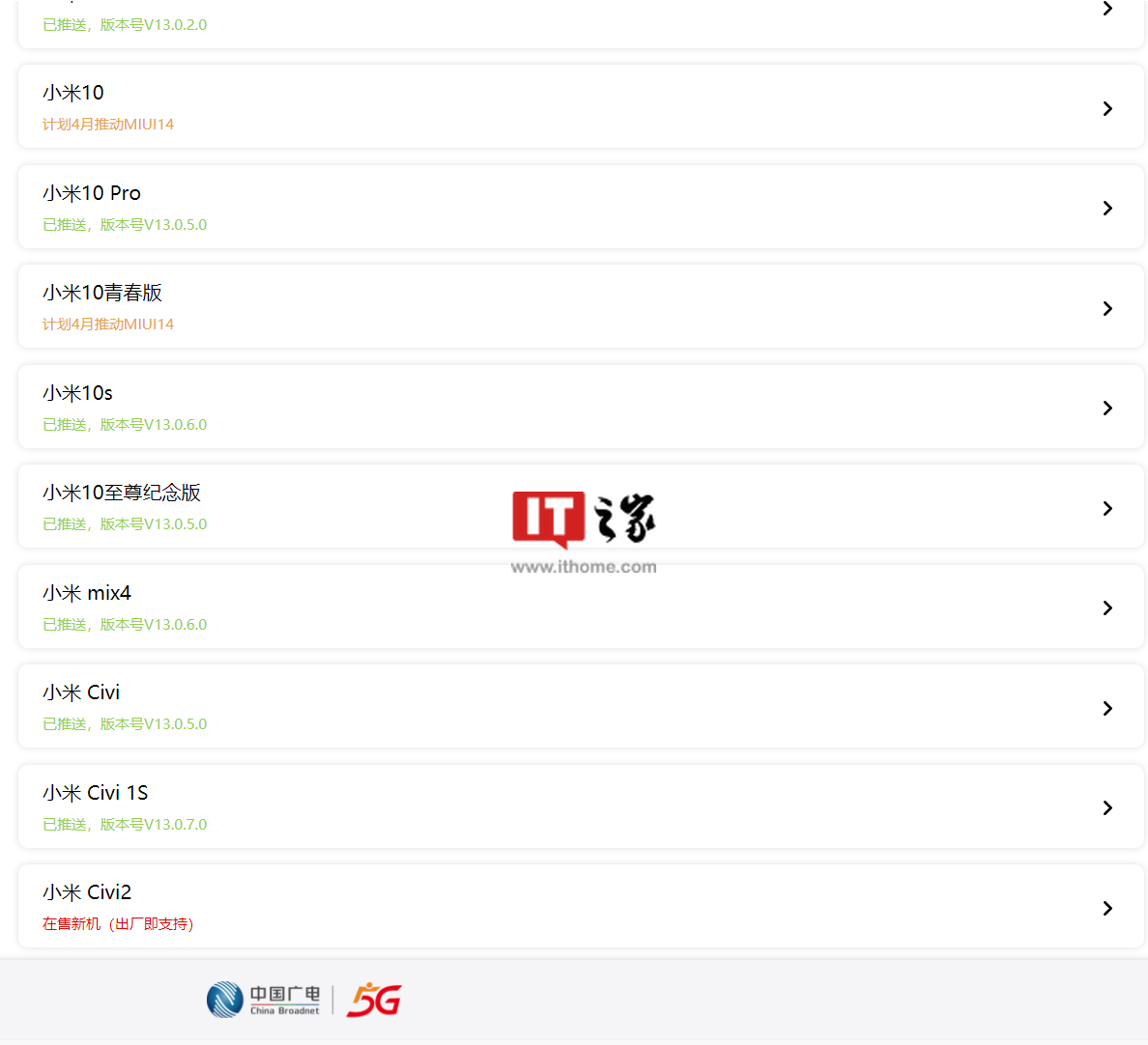 据中国广电终端适配网站显示,在适配广电网络的终端型号中,小米 10 和小米 10 青春版计划 4 月“推动” MIUI 14 系统。小米 11 青春版、小米 11 Lite 5G NE 和小米 10 Pro 已推送了最新的 MIUI 13 系统。