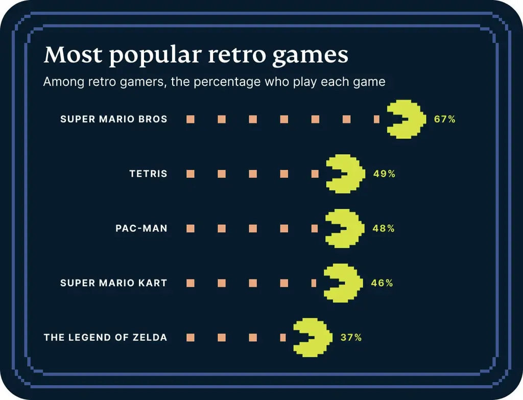 调查报告显示,最受玩家喜欢的 5 款游戏分别为《超级马里奥》、《俄罗斯方块》、《吃豆人》、《超级马里奥赛车》和《塞尔达传说》。