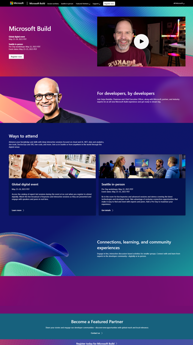 Build 2023 活动网站现已开放注册。虚拟活动将于 5 月 23 日至 24 日举行,与会者无需支付任何费用。大家将能够观看微软首席执行官 Satya Nadella (萨提亚・纳德拉)的主题演讲,以及其他研讨会和活动。