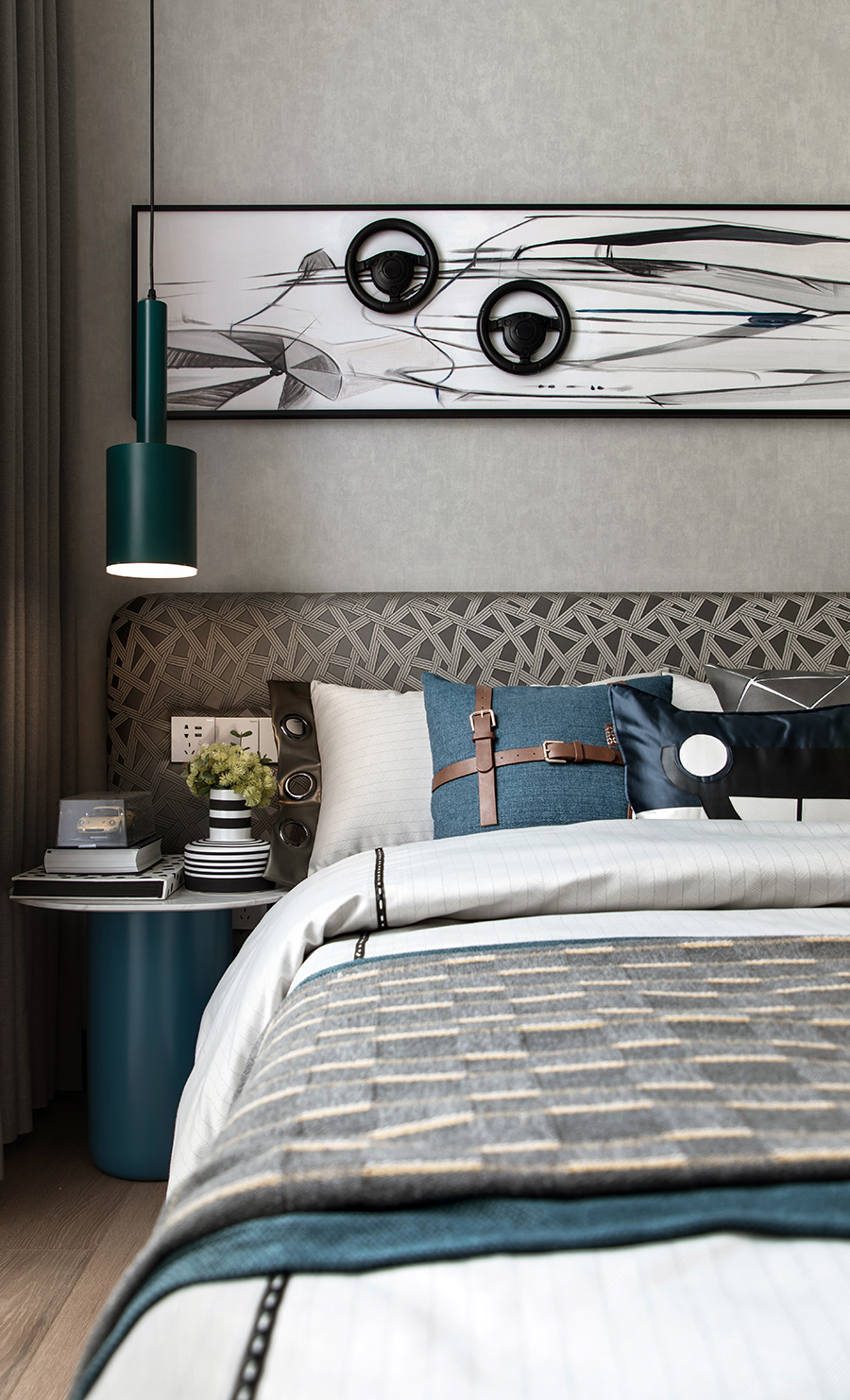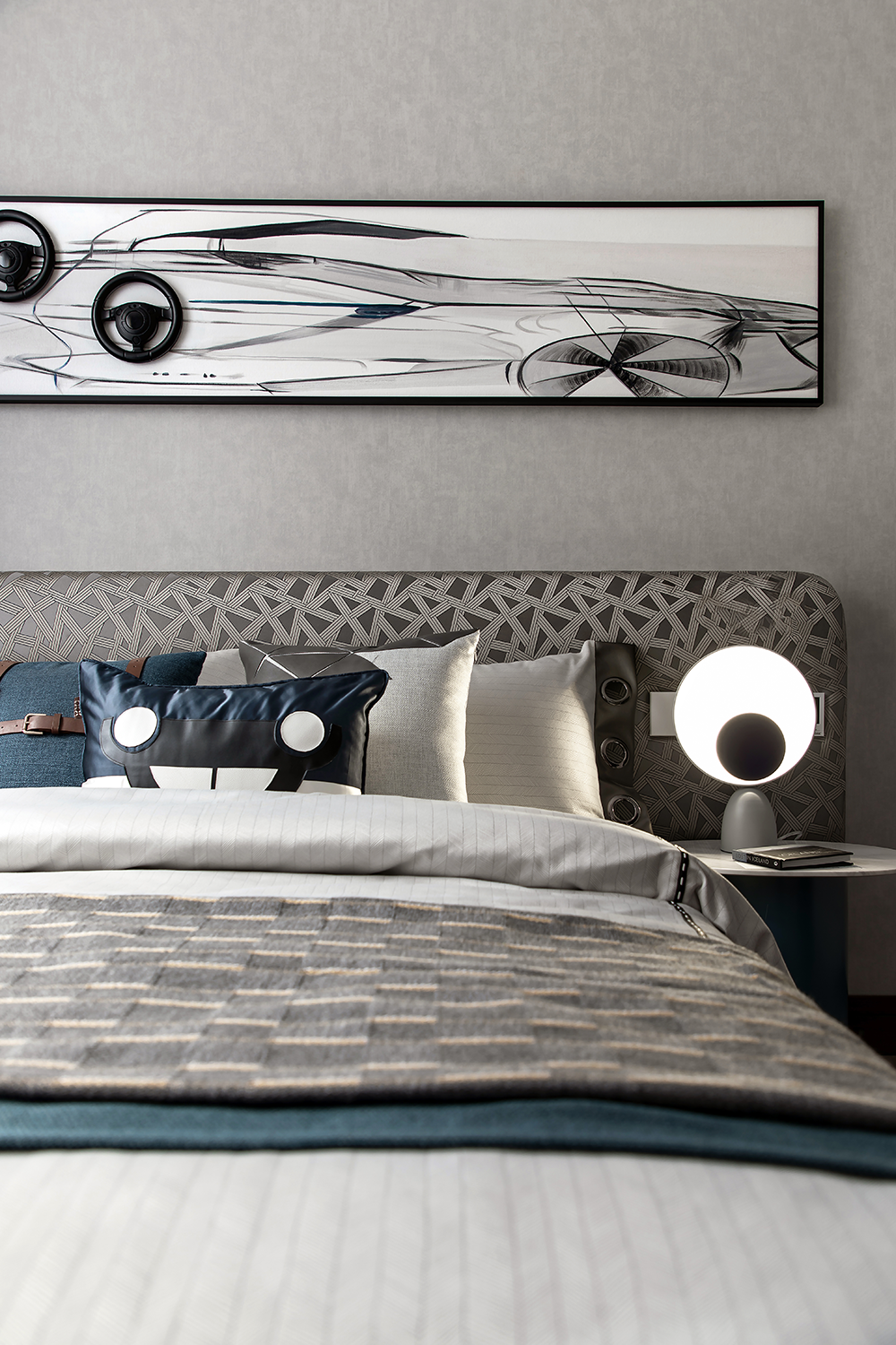 床头柜上的精致车模、抱枕的车子图形以及挂画上疾驰的跑车,无不呼应着小主人的爱好和乐趣……设计以温暖抵达孩童内心深处的渴望,令每个日常活泼而饱含生机。