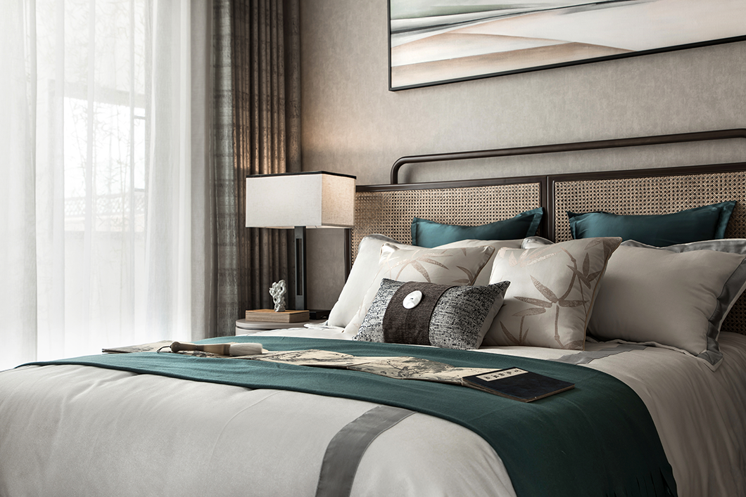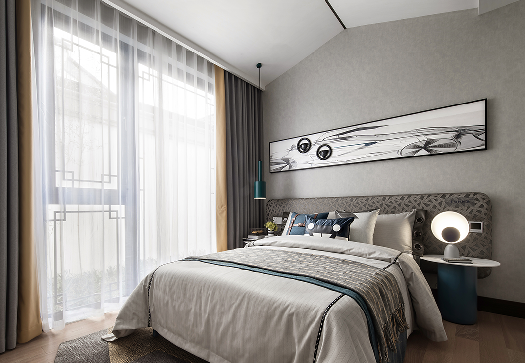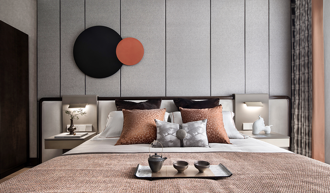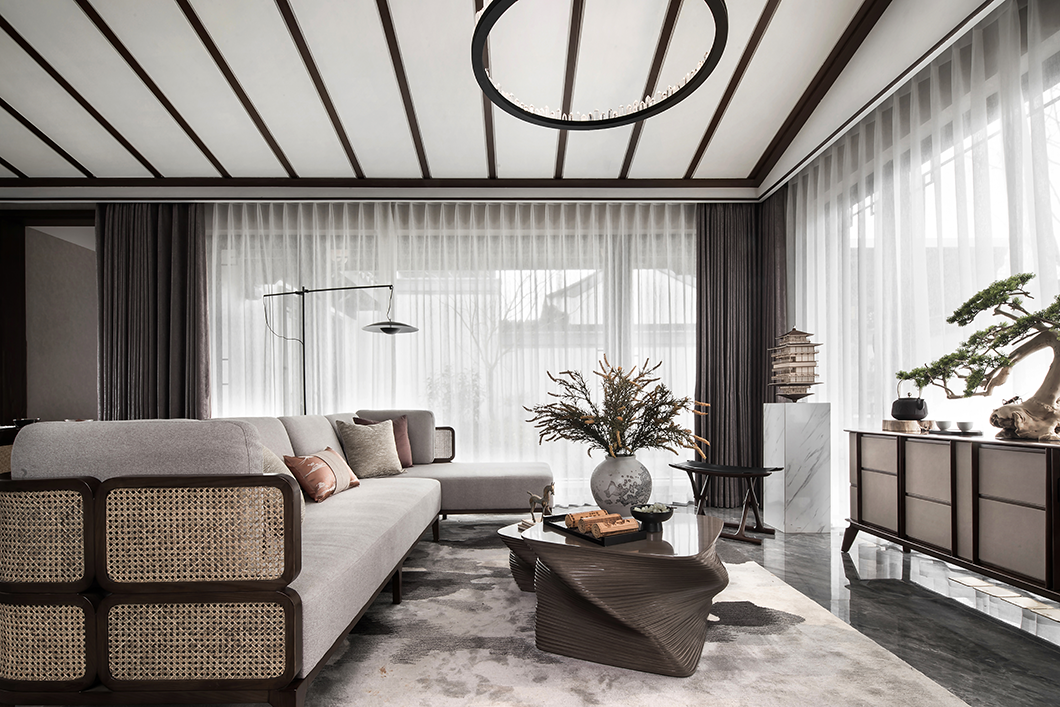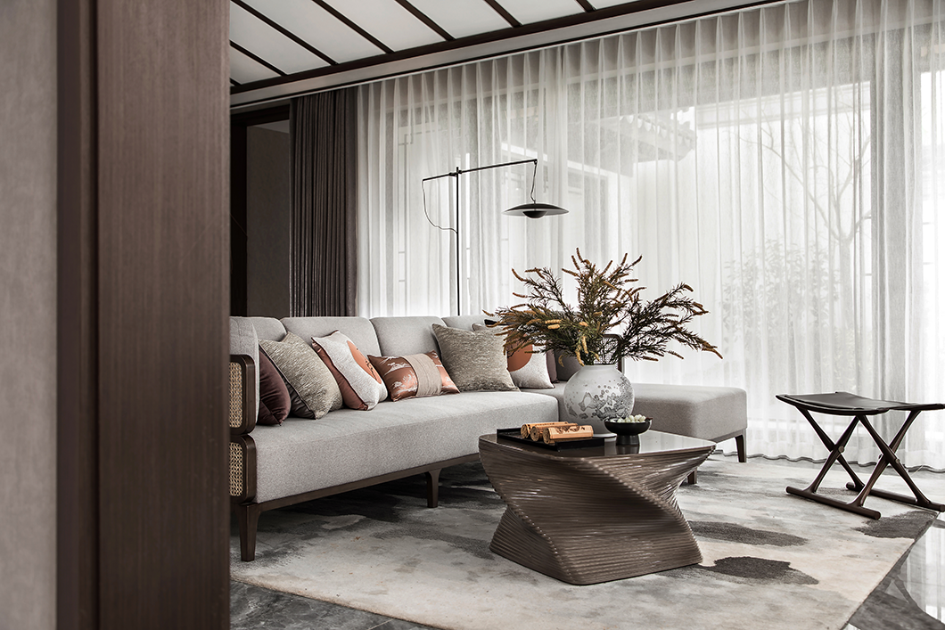 浅灰色棉麻布艺沙发、泼墨花纹地毯、深色木制家具、古朴韵味的花瓶、古卷小品等现代形制的家具陈设糅合中式绵绵古意,贯穿于空间的情致中,将俊雅幽然的氛围无声渲染。