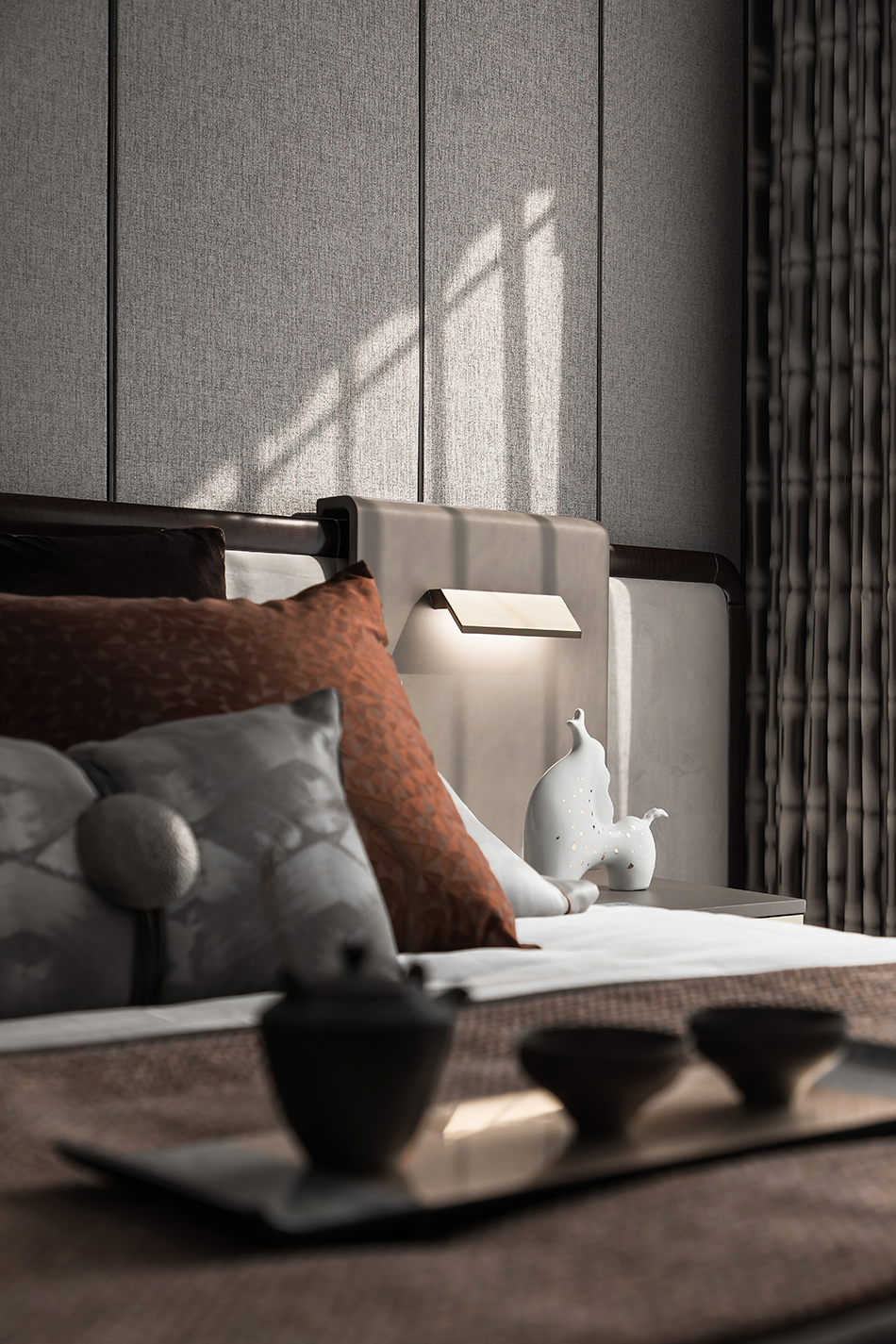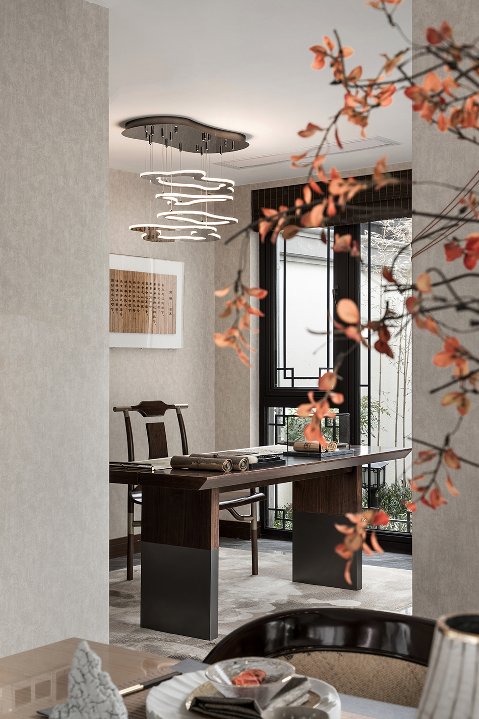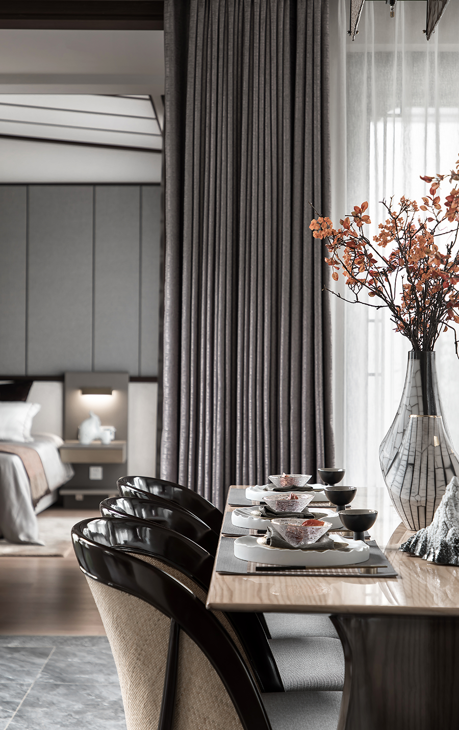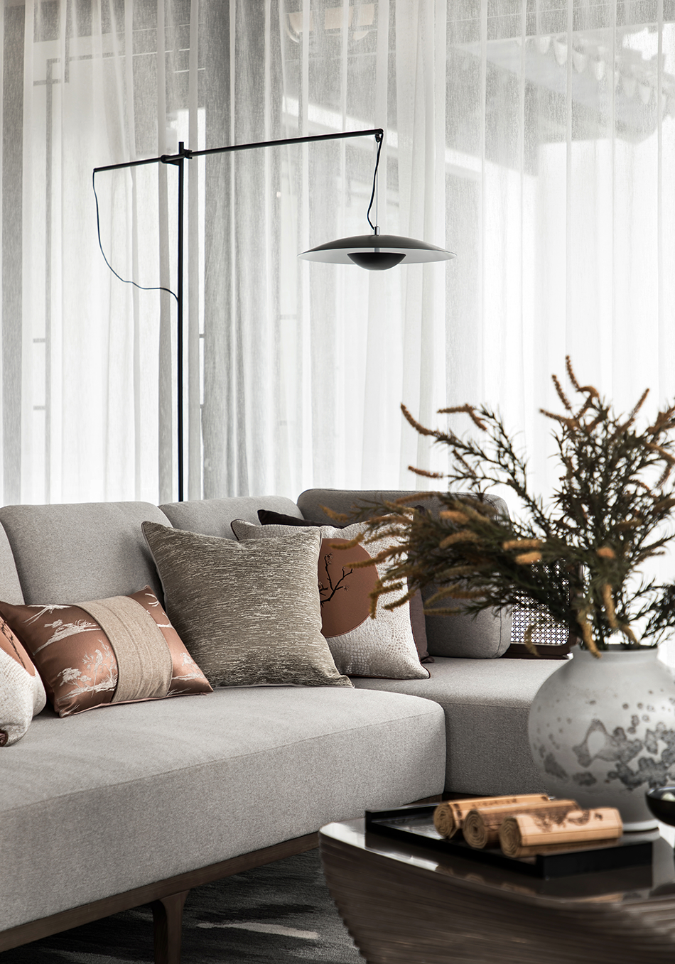 浅灰色棉麻布艺沙发、泼墨花纹地毯、深色木制家具、古朴韵味的花瓶、古卷小品等现代形制的家具陈设糅合中式绵绵古意,贯穿于空间的情致中,将俊雅幽然的氛围无声渲染。