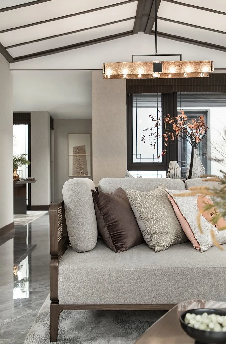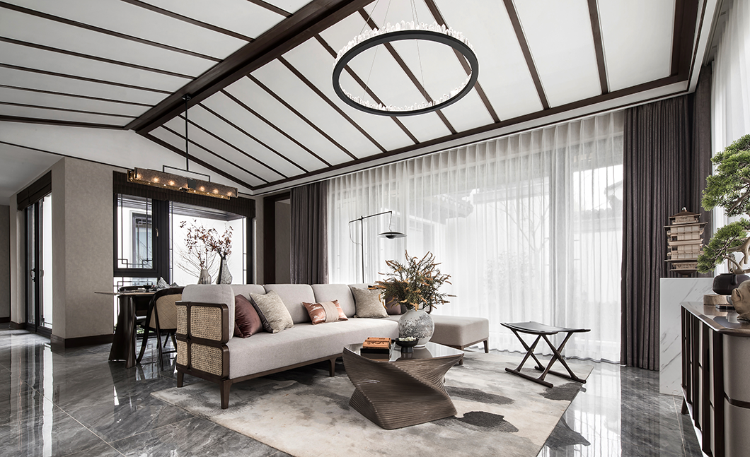 客厅空间整体简洁明净,顶面古梁现代设计手法的处理手法,将东方哲学与当代人的审美情趣完美融合,并营造出东方的气质美学,使空间在不露声色中流淌出涓涓禅意。