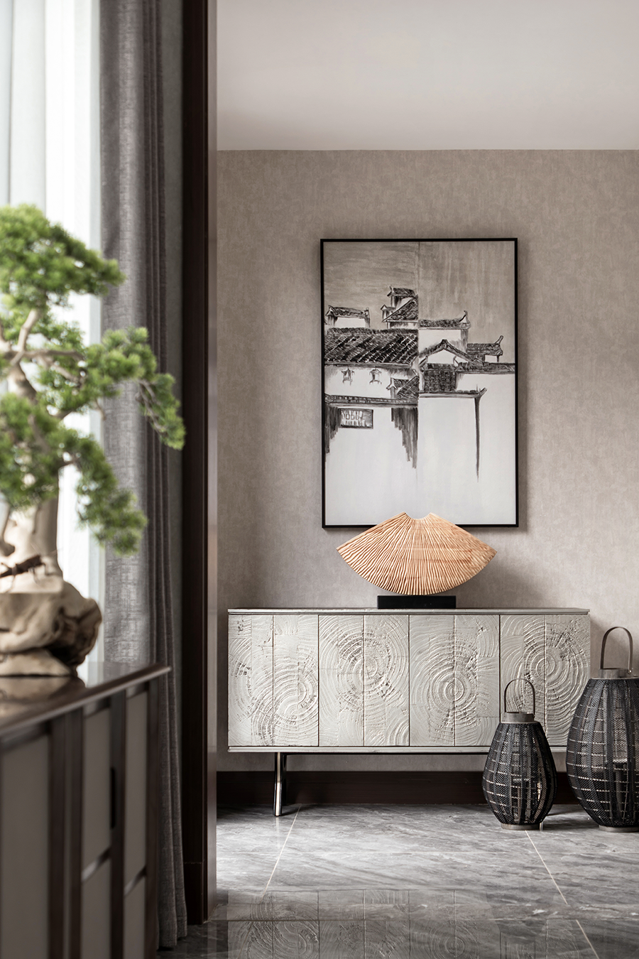 步入玄关,江南建筑写意装饰画将园林院景基调延续至室内,中式器具与摆件,自带古韵,作为空间的点睛之笔,古色古香,陈列而至,禅意顿生,风雅自来。