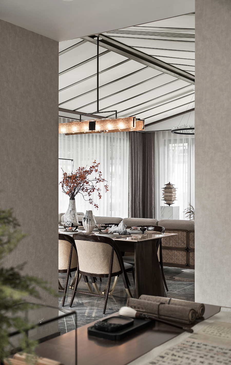 承袭建筑立意,以奢雅新中式定位,用内在文化与精神的渗透,结合当下的设计语言阐述精英品质生活方式。