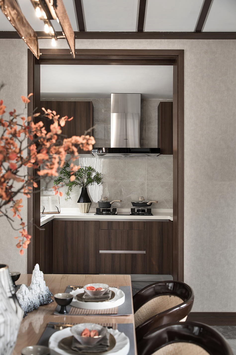 木纹极简风格的橱柜,在功能完备的基础上,对空间进行了完美延续。素日时光,在温暖的摆件中凸显浪漫。在充满雅趣的用餐氛围里,有窗景为伴,一日、三餐、四季,家的仪式感与人间烟火色,凡间的温暖挚爱,在百般滋味间得以修炼。