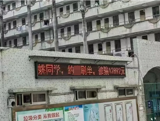 近日,广东,网传湛江一高校宿舍楼电子屏上挂出“姚同学约X刷单被骗”信息,引发关注。