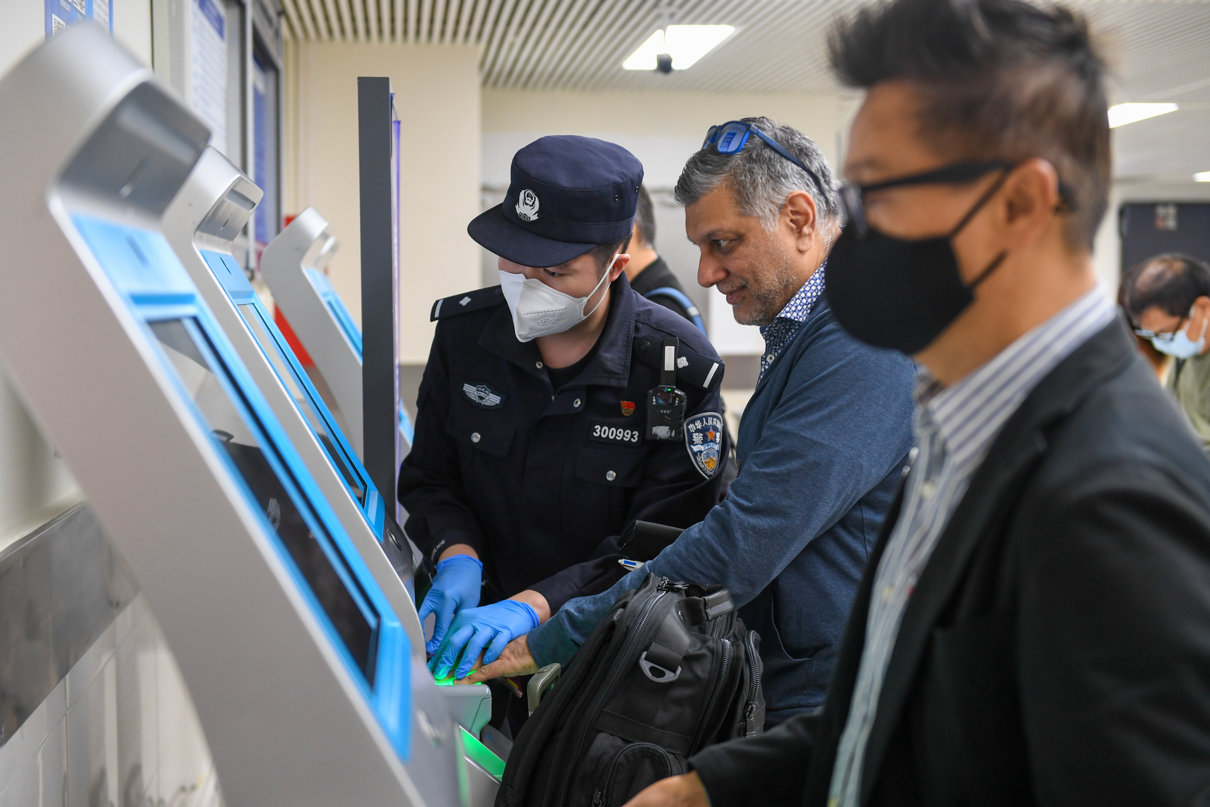 3月15日,在深圳罗湖口岸入境检查大厅,罗湖边检站民警为外国旅客办理入境手续。 新华社发(黄晨熹摄)