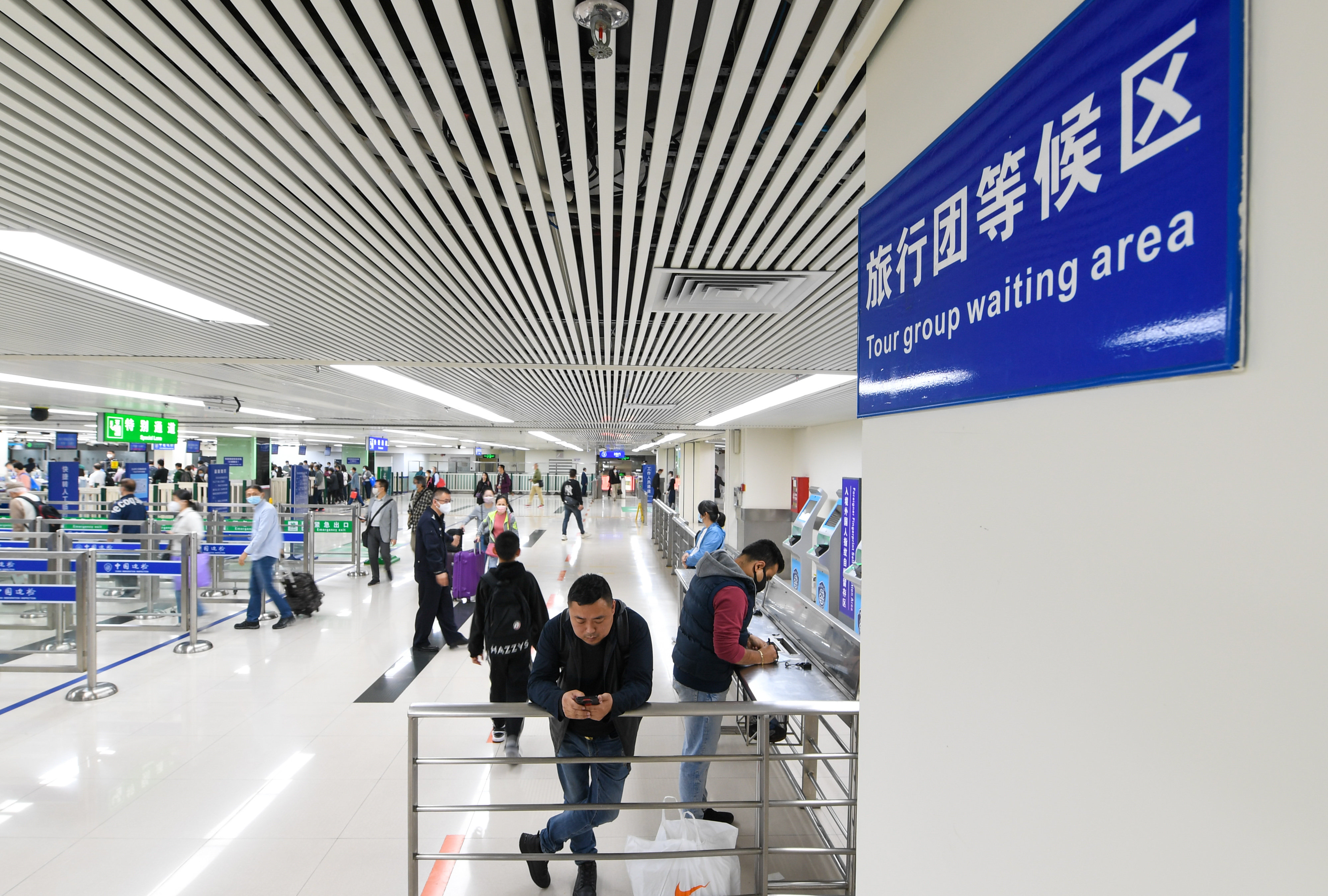 3月15日,外国旅客在深圳罗湖口岸入境检查大厅候检通关。 新华社记者毛思倩摄
