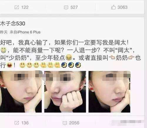 她一度低调而紧张地解释,“老公很节约,22亿和我们家并没什么关系”,却又能发两张嘟着嘴的自拍,希望网友别叫她豪门阔太,因为听起来显老。