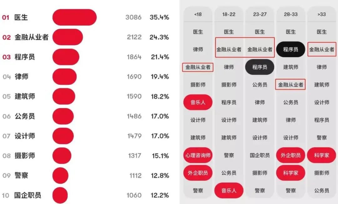 2021年的一则投票也显示,不同年龄段中,女孩对对象是金融从业者的喜爱度仅次于医生,稳居前四。