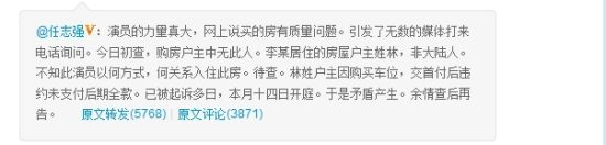 随后,该楼盘开发商之一的华远地产董事长任志强却发博质疑:这房业主姓林、并非大陆人,而且,对方交首付后违约未支付后期全款、已被起诉。
