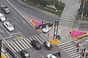 红星新闻记者从现场视频中看到,一辆白色小轿车行驶在道路右侧直行车道时,稍微做了停顿,而后试图右转。但转到右侧后,车辆停止在斑马线位置。几秒钟之后,车辆突然再向右行驶,径直开到了安全岛上的花台里,撞倒了红绿灯,停在了花台另一侧。