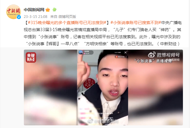 中央广播电视总台第33届3·15晚会曝光苦情戏直播局中局,“儿子”们专门骗老人买“神药”。其中提到“小张说事”账号,记者在相关视频平台已无法搜索到。此外,曝光中涉及到的“小张说事『辉哥』—早八点”“方明快相亲”等账号,也已无法搜到。(中新财经)