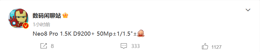 数码博主“数码闲聊站”爆料,iQOO Neo8 Pro 配备 1.5K 屏幕,搭载天玑 9200 + 处理器,采用 1/1.5 英寸 5000 万像素主摄。
