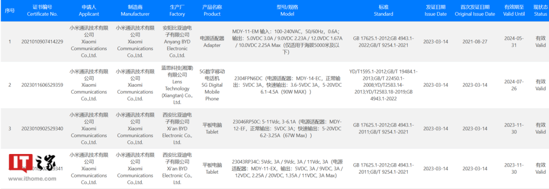 除此之外还有型号为 23046RP50C 和 23043RP34C 的两款平板电脑产品也通过了 3C 认证,前者由西安比亚迪电子代工,搭配 MDY-12-EF 充电器销售,最高 67W 快充;后者支持最高 33W 快充。