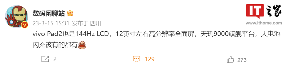 今日,微博博主 @数码闲聊站 爆料了有关 vivo Pad 2 的更多配置信息。
