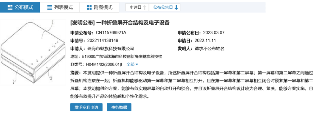 珠海市魅族科技有限公司申请的“一种折叠屏开合结构及电子设备”专利近日公布。