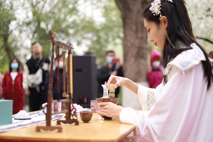 记者在现场看到,各式民俗摊位展示着“颜值爆表”的樱花文创产品和特色樱花美食,极具古典韵味的汉服表演、茶艺表演吸引了众多游客驻足观赏。