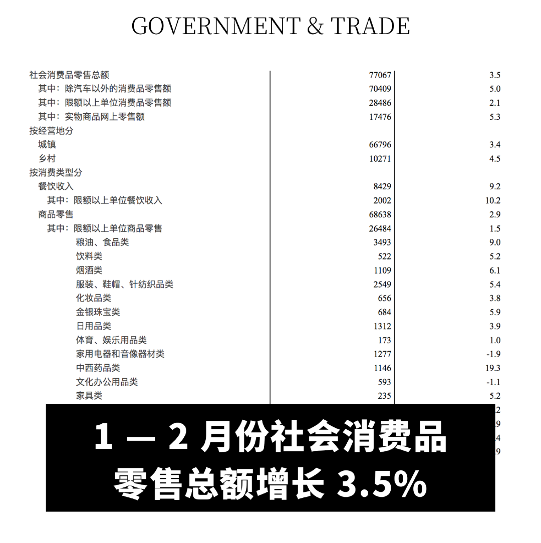 据国家统计局数据显示,1 — 2 月份,社会消费品零售总额 77067 亿元,同比增长 3.5%。其中,除汽车以外的消费品零售额 70409 亿元,增长 5.0%。其中服装、鞋帽、针纺织品类零售额达 2549 亿元,同比增长 5.4%,化妆品类零售额达 656 亿元,同比增长 3.8%,金银珠宝类零售额达 684 亿元,同比增长 5.9%。(yalta)