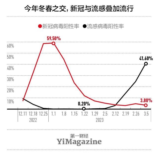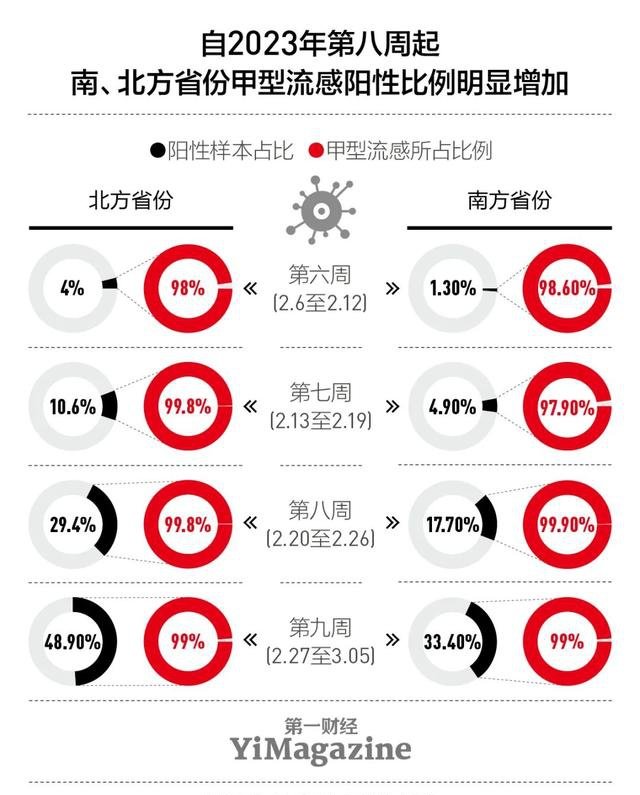3月10日,根据国家流感中心发布的今年第九周流感周报,全国南、北方省份的流感病毒检测阳性率已连续6周持续攀升。其中,甲型流感病毒占绝对优势。在2月5日至3月5日的28天内,全国哨点医院报告的流感病毒阳性率从0.7%激增到了41.6%,涨了近60倍。